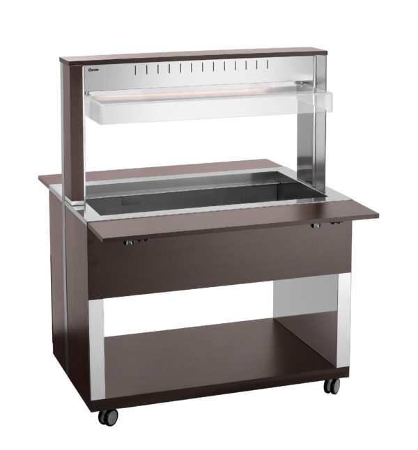 De mobiele buffetoplossing in een modern houtdesign – De buffetwagen met hoestbescherming en led-verlichting voor 3 GN-containers 1/1 GN en houdt met het waterbad-principe gerechten behoedzaam en aangenaam warm bij het buffet.