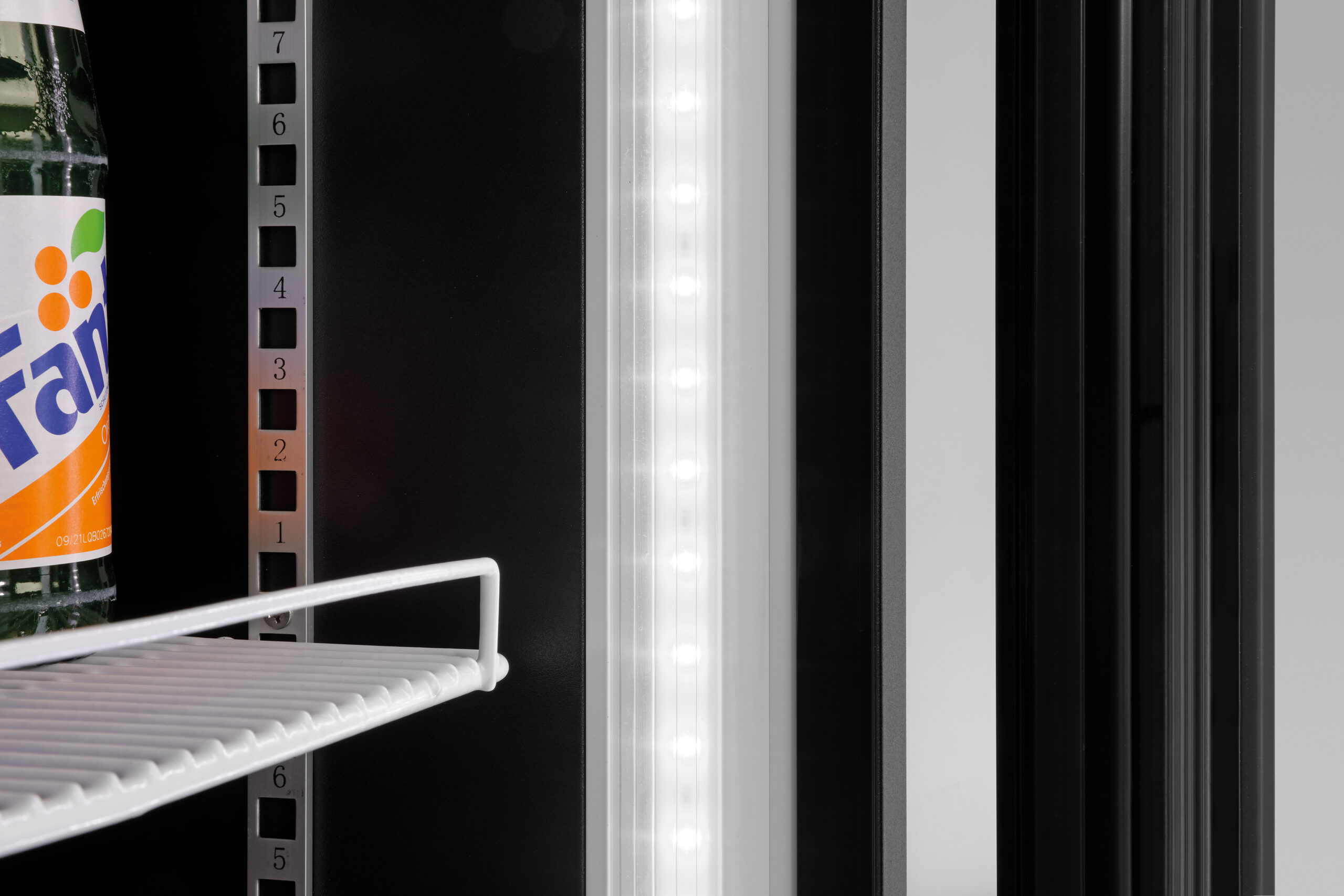 Zwart, smal, elegant – Een bijzonder dessign, dat meteen opvalt. Eten en drinken zien er direct aantrekkelijker en hoogwaardiger uit in deze koelkast met glazen deur en led-verlichting.
